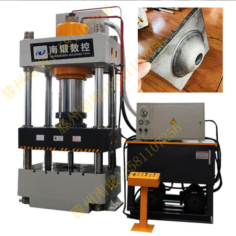 2、3多噸拉伸液壓機-帶下頂缸拉伸機。壓力從下往上頂出, 通過油缸來產生壓力,帶有頂出缸裝置,主要是滕州南鍛方便工件從模具中取出。主要工作過程:當液壓機主缸回程停止運動后,操作者按下頂出按鈕,相應電磁鐵得電,開啟插裝閥,液壓油經插裝閥進入頂出缸的下腔,而上腔的油液就流回到油箱里,工件被頂出,頂出后頂出缸還要進行退回;然后,四柱液壓機的操作人員按下退回按鈕,電磁鐵失電,開啟插裝閥,液壓油進入頂出缸上腔,下腔油液流回油箱,頂出缸回程,形成循環系統維持四柱液壓機的持續運動。